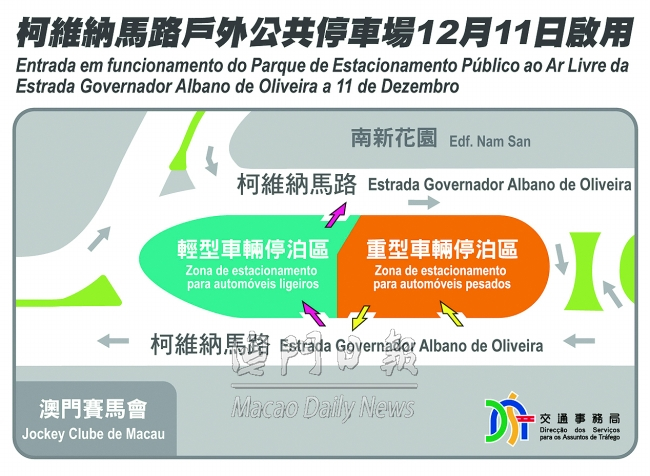 ![]() 柯維納馬路戶外公共停車場示意圖 提供四十一輕型十七重型汽車泊位 柯維納戶外停車場下周一啟用 【澳門日報消息】交通局訊:位於氹仔柯維納馬路的“柯維納馬路戶外公共停車場”,由本月十一日(周一)上午十時起對外開放使用,提供四十一個輕型汽車及十七個重型汽車泊車位。停車場不設月票,所有停泊車輛按時收費,輕型汽車日間(上午八時至晚上八時前)每小時或不足一小時八元,夜間(晚上八時至翌日上午八時前)四元;重型汽車日間每小時或不足一小時十元,夜間五元。 三種收費模式 “柯維納馬路戶外公共停車場”位於氹仔柯維納馬路並介乎於廣東大馬路與沙維斯街的地面中央分隔帶,為《公共泊車服務制度》法案自本年八月一日生效後,首個重新規劃並開放使用的戶外公共停車場。停車場暫時提供三種收費模式,包括澳門通、MPay以及銀聯閃付卡電子收費系統;停車場入口設有泊車位餘額顯示屏,亦會於交通事務局網頁及交通資訊站App的“公共停車場實時資訊”發佈有關停車場的實時餘額資訊。 |